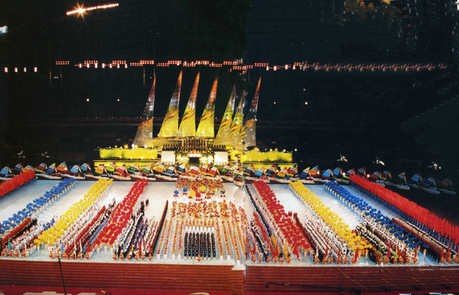 (一)国旗、会旗和裁判员、参赛代表团代表入场(广东省、香港特别行政区、澳门特别行政区,三地代表团同时入场)